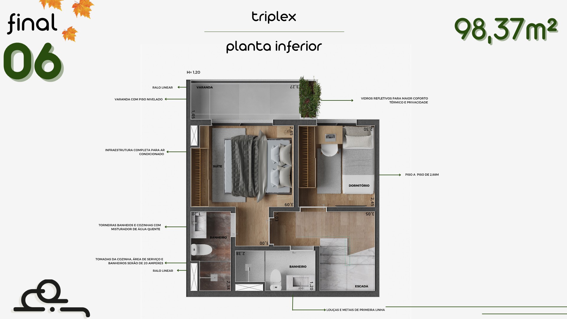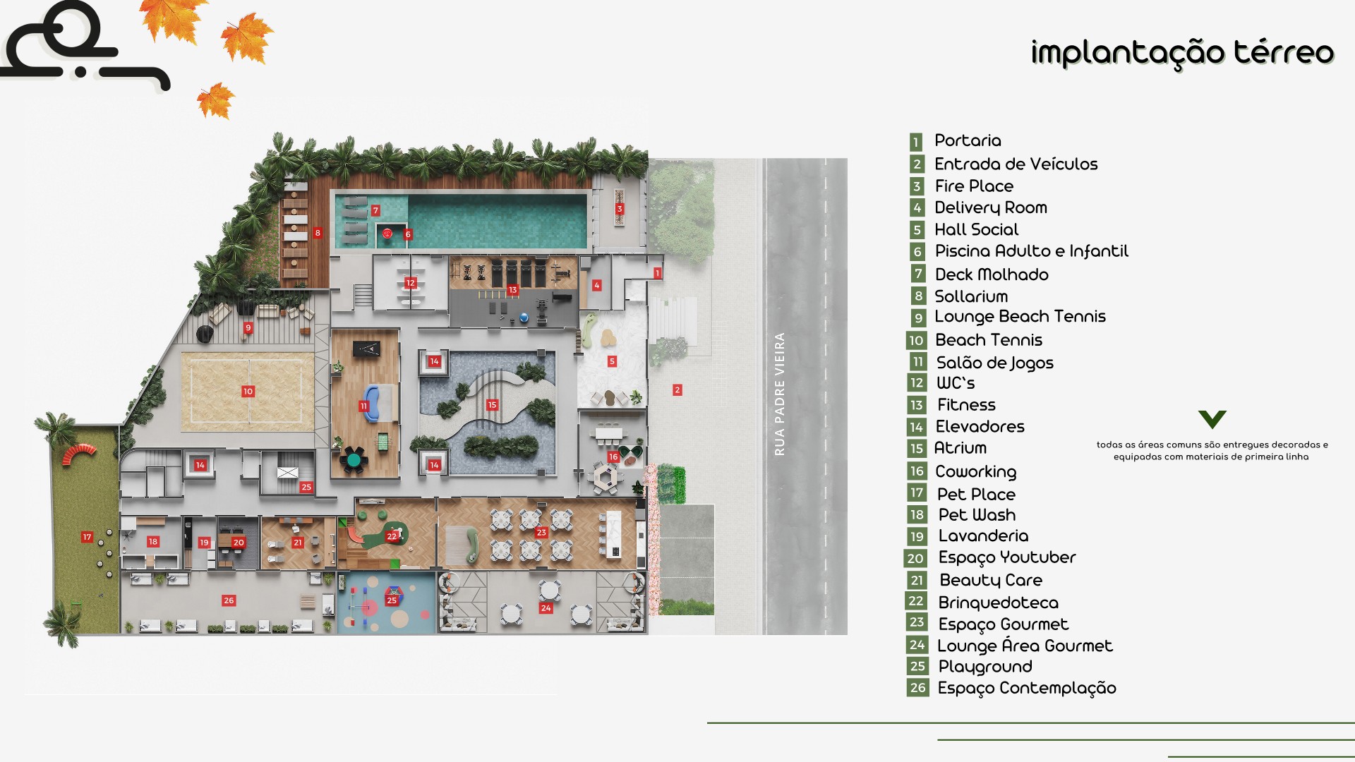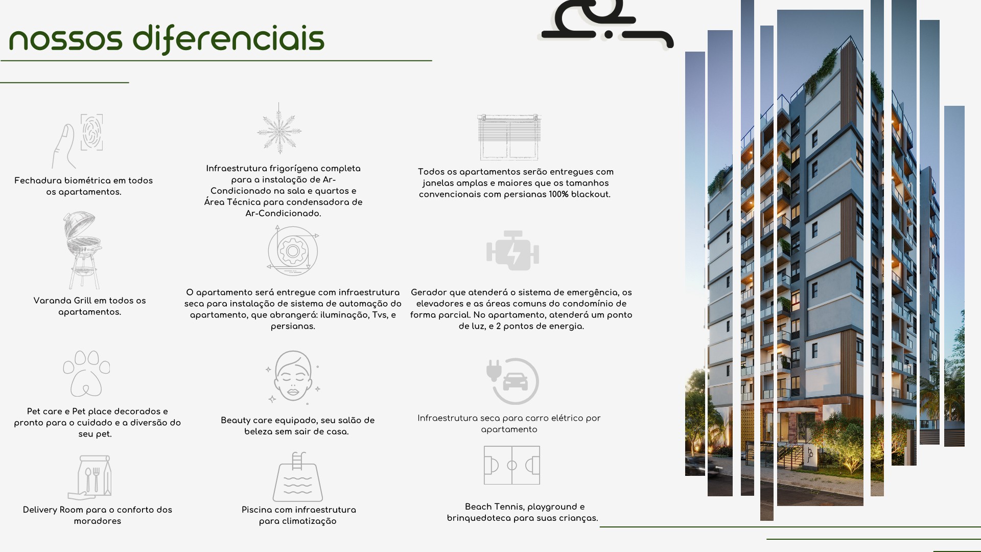 - Conceito: Residencial urbano de alto padrão com forte integração ao verde, lazer completo e walkability máxima.