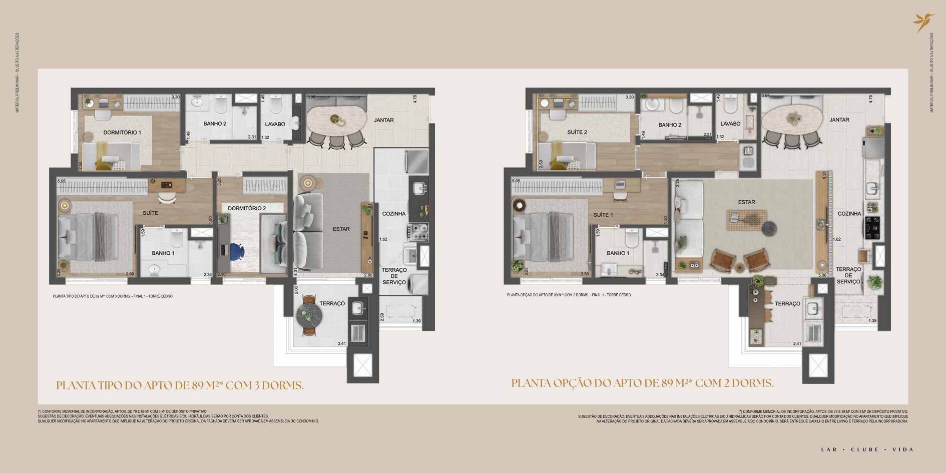 Apartamentos de 79 m² e 89 m² contam com depósito privativo de 3 m².